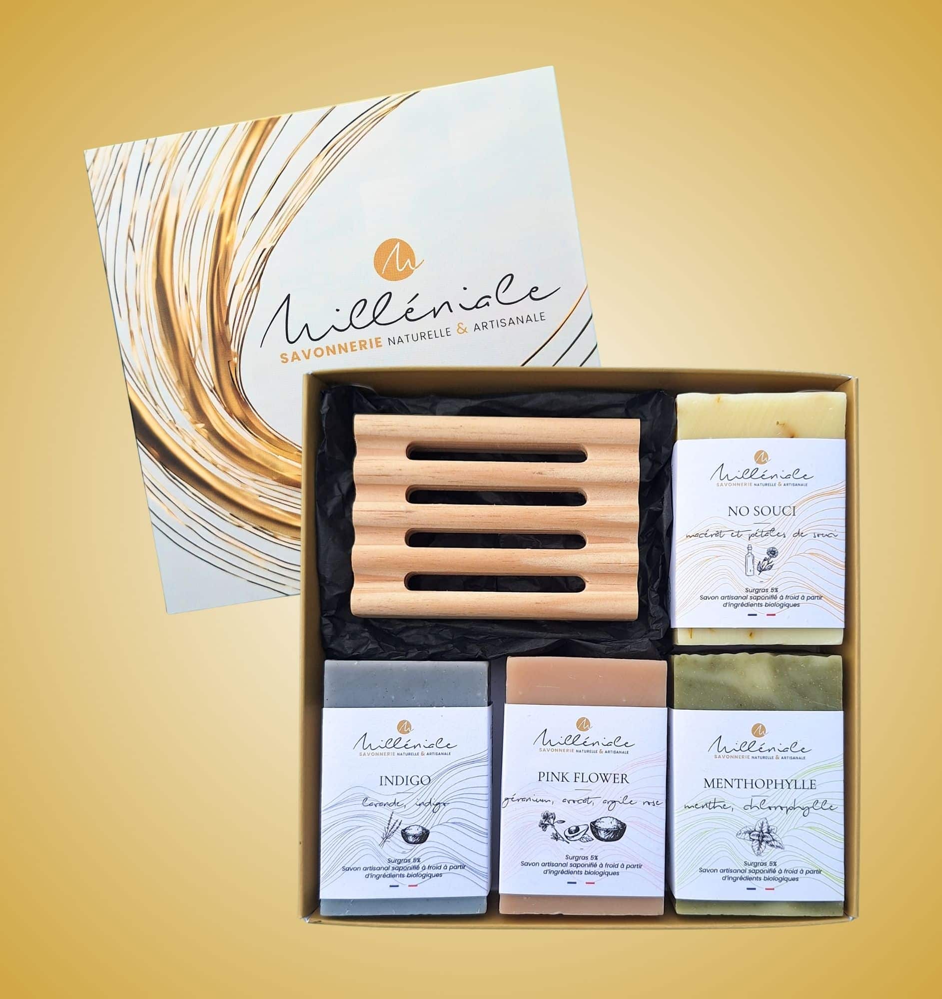 Offrez un moment de bien-être avec notre coffret 4 savons + porte-savon en pin.