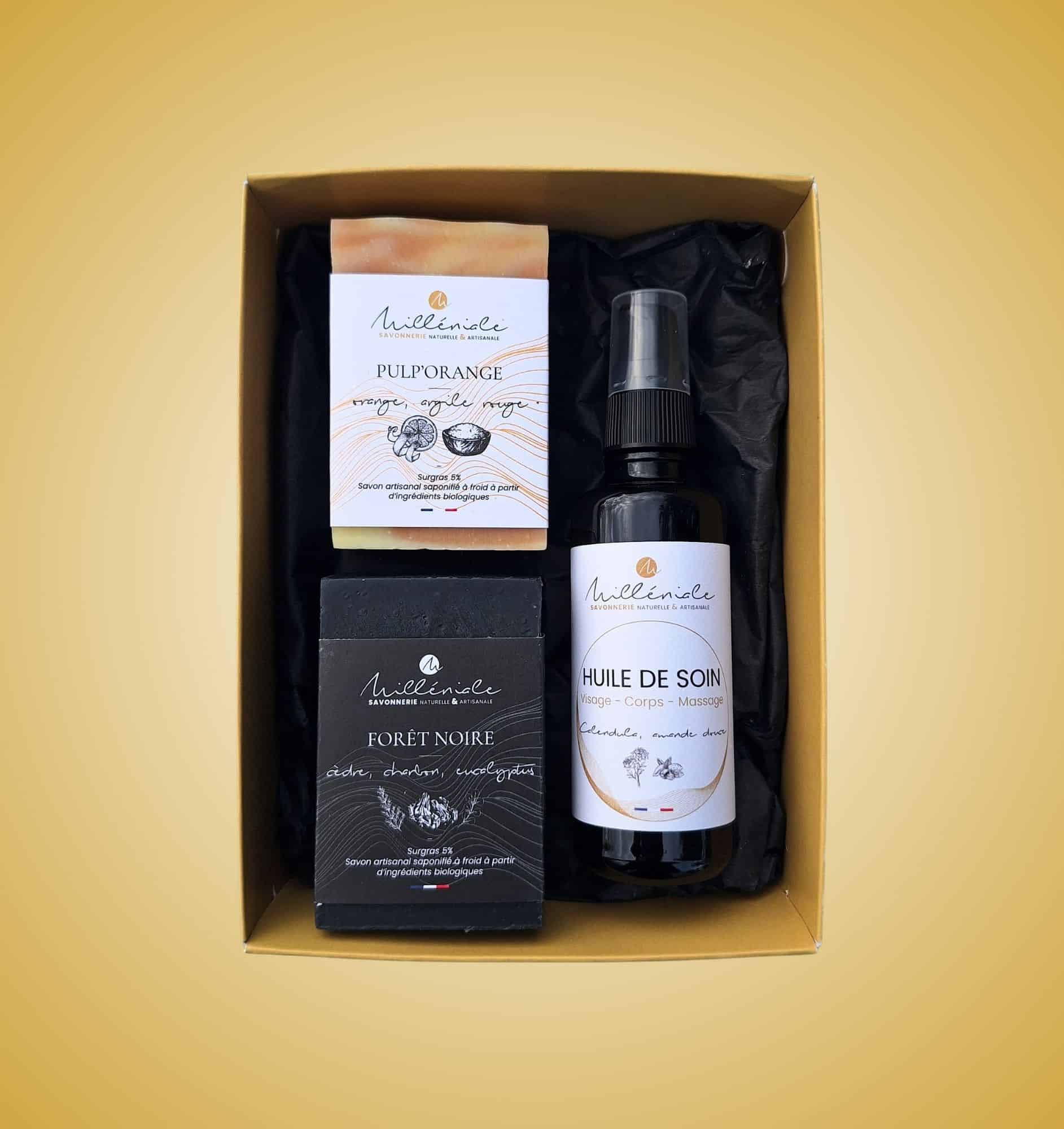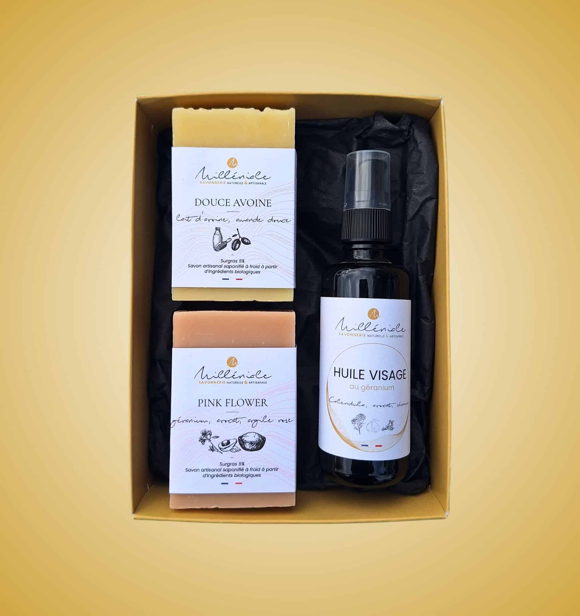 Deux savons artisanaux au choix et un cosmétique naturel. Un coffret de soin incomparable, complet et raffiné pour un rituel beauté unique.