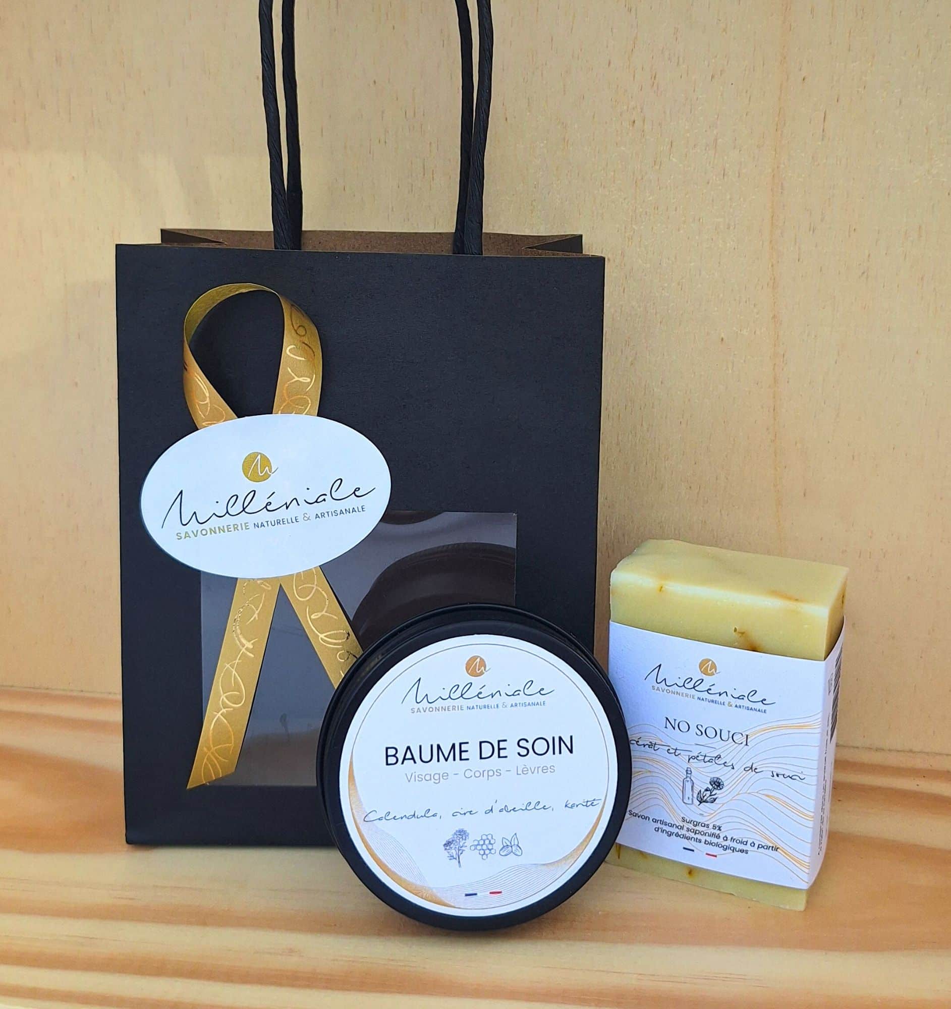 Le cosmétique au choix vient compléter ce duo de soin. Baume de soin nourrissant, huile visage ou huile de soin : chaque produit contient des ingrédients issus de l’agriculture biologique. En effet, nous sélectionnons chaque composant pour sa qualité, son efficacité et sa douceur naturelle. Ainsi, le coffret offre une routine complète, simple et respectueuse de la peau comme de l’environnement.