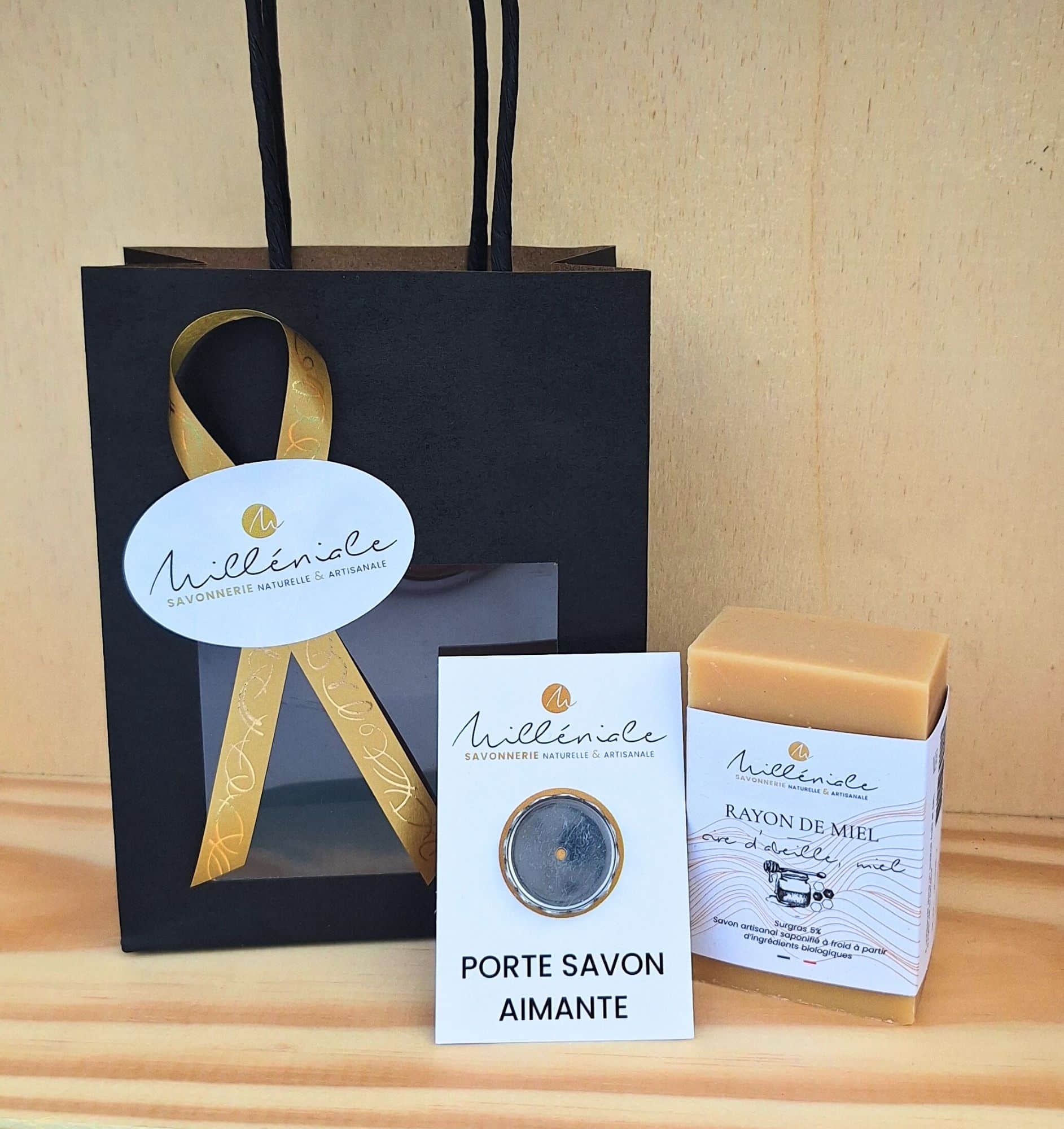 Offrez un duo naturel et élégant avec notre sac cadeau savon + porte-savon aimanté. Un cadeau artisanal, utile et plein de douceur à personnaliser selon vos envies.